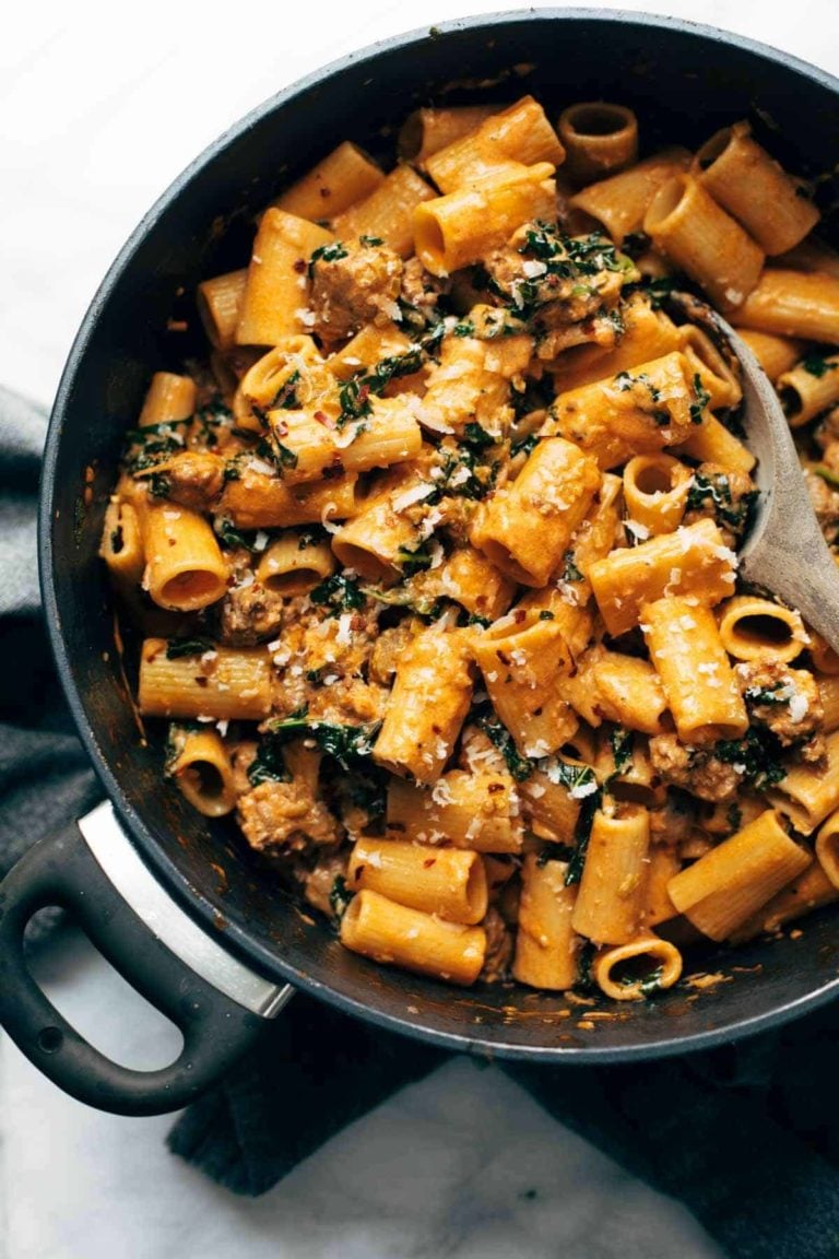 AMAZING rigatoni with sausage, kale, tomato cream sauce, Parmesan, and red pepper flakes! Perfect for date night!