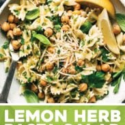 A super fresh, super summery Lemon Herb Pasta Salad! Packed with tangy marinated chickpeas, chewy pasta, lots of herbs and garlic, lemon juice and olive oil, and a handful of parmesan to top it off.